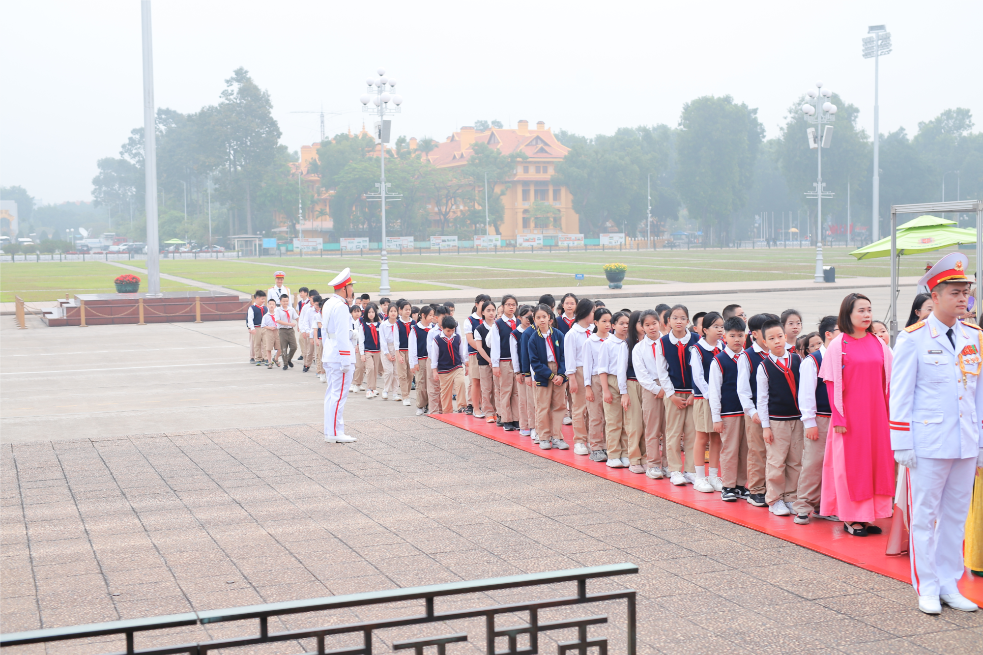 lên đường đến Quảng trường Ba Đình – nơi có Lăng Chủ tịch Hồ Chí Minh. Trong không khí trang nghiêm, các em lần lượt