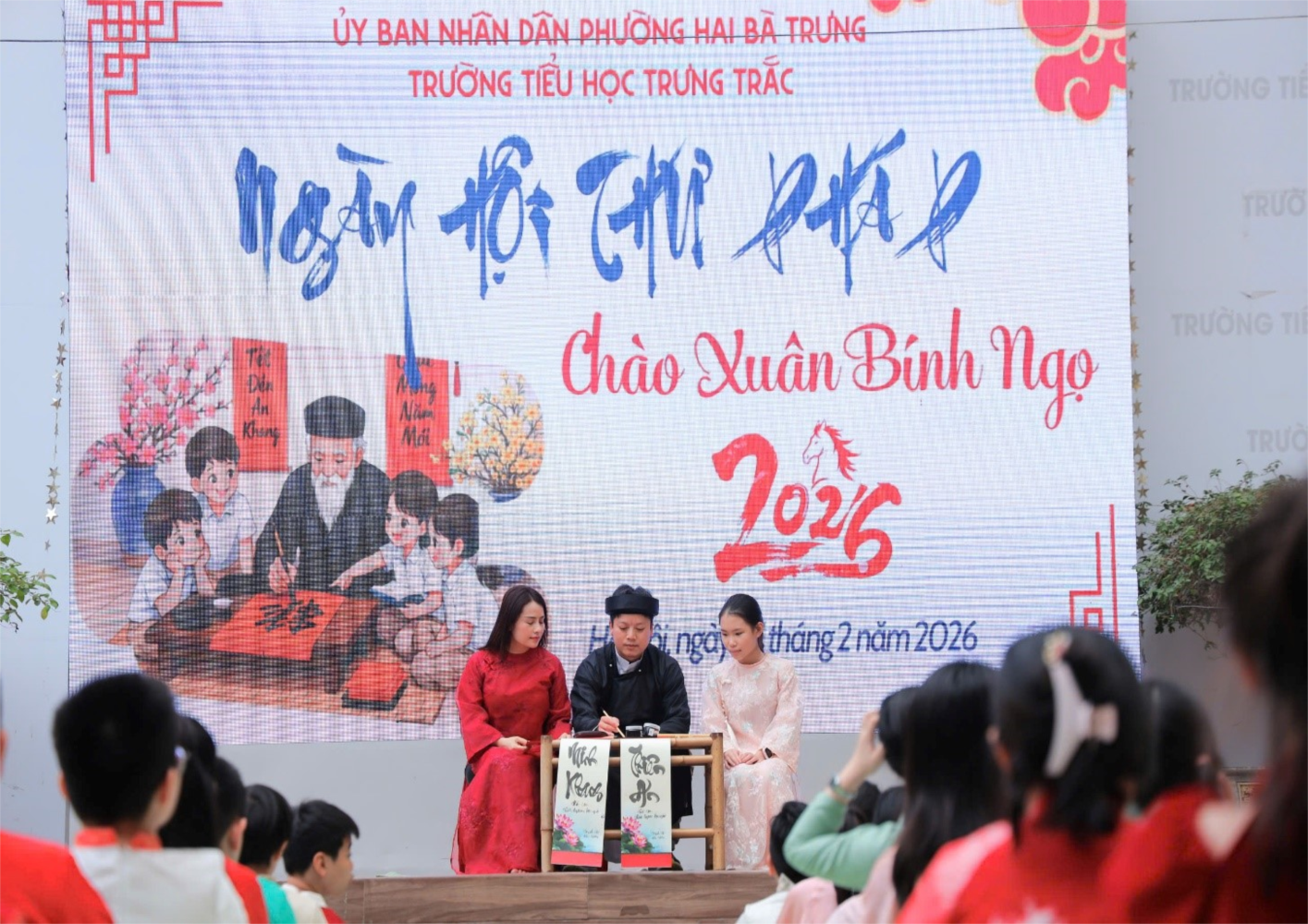 sự hướng dẫn tận tình của thầy cô và các nghệ nhân thư pháp, các em học sinh